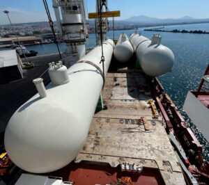 “One of our biggest projects yet. Cosmatos Group is proud to announce the successful delivery of three propylene storage bullet tanks, each up to an impressive 650 tons, loaded from Thessaloniki Port and safely discharged at Soussaki Port.