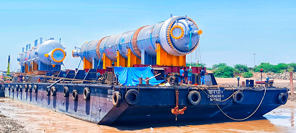 Marine Operations: At the jetty, our team executed a precision loadout of both components onto a 180-class cargo barge. Our experienced marine engineers implemented comprehensive sea fastening protocols to secure the cargo for the subsequent sea journey to the northwestern part of India. Since this was a beaching operation, it was critical to adhere to the tidal variations and complete load out in the required time lines. The roll-on operations were flawless and all timeframes were met resulting in successful loadout.