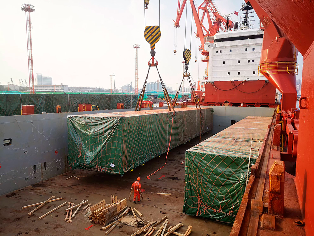 The project cantered around the transportation of 9 packages, featuring four over size Cold Boxes with remarkable dimensions of 33.5 x 4.95 x 4 m. With a total gross weight of 390 ton and a volume of 2,500 FRT, the operation demanded exceptional precision and specialized handling.