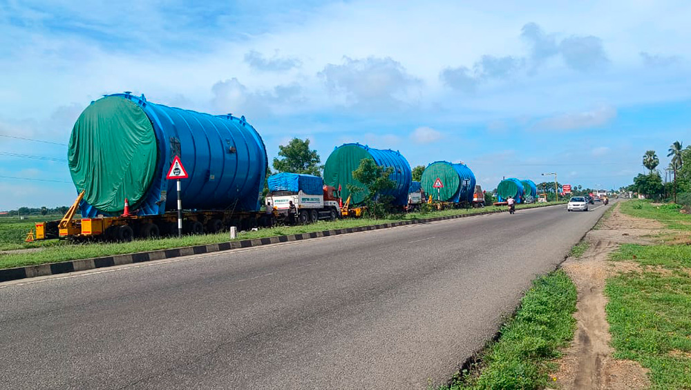 The transportation from Tuticorin Port to the designated job site covered 250 km and a combination of heavy-duty and low-bed multi-axle trailers where utilized.