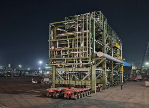 During the project, we encountered unexpected material obstructions that blocked our planned route. Instead of stopping work, our team demonstrated exceptional problem-solving skills and recalculated trailer load balances on-site, implemented alternate plans to navigate around obstructions, made real-time adjustments to SPMT configurations and used an adaptive approach with continuous cross-functional coordination. This flexibility and technical expertise kept the project moving forward on schedule.