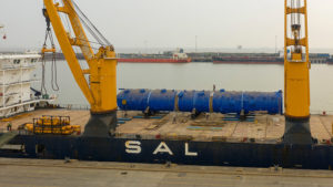 Considerable civil works were also carried out enroute from the supplier’s factory to the port. Following the arrival of the vessel, the cargo was moved from storage to the berth, and fed under the vessel’s hook, and loaded onto the vessel’s deck.