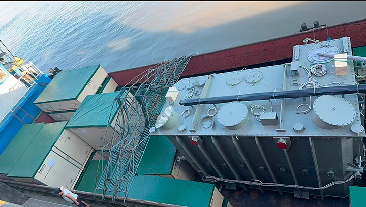 The shipment comprised two 60MVA/230KV transformers, each measuring 6.45 x 3.75 x 4.35 meters and weighing 104 tonnes. Including accessories, the total shipment volume amounted to 428 cubic meters and 253 tonnes. The transformers were delivered by barge and directly loaded from the vessel via a double-banking operation.