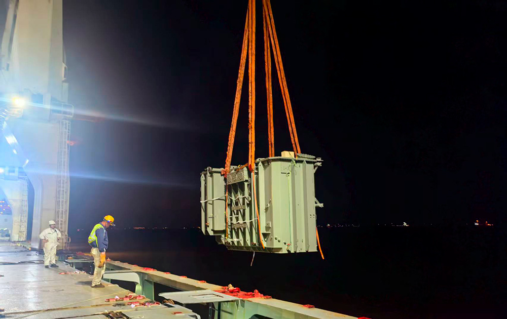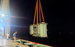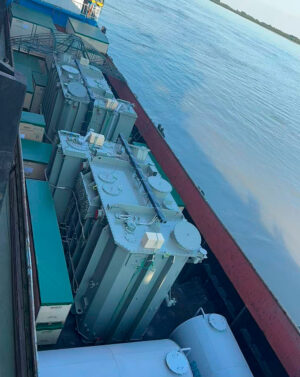 The shipment comprised two 60MVA/230KV transformers, each measuring 6.45 x 3.75 x 4.35 meters and weighing 104 tonnes. Including accessories, the total shipment volume amounted to 428 cubic meters and 253 tonnes. The transformers were delivered by barge and directly loaded from the vessel via a double-banking operation.